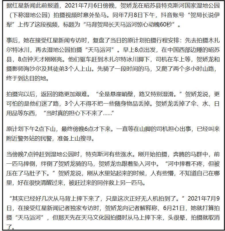 根据媒体的报道可知,1月11日,因为工作需要,贺娇龙在博乐市进行农产品电商销售活动前期拍摄时,意外坠马致头部严重受伤。随后贺娇龙被送往医院,各方力量积极抢救。