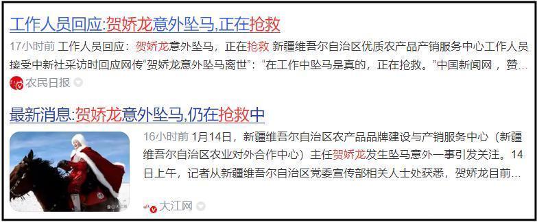 到了下午,新疆相关部门和单位进行了辟谣,表示贺娇龙坠马受伤,还在医院抢救,没有去世。
